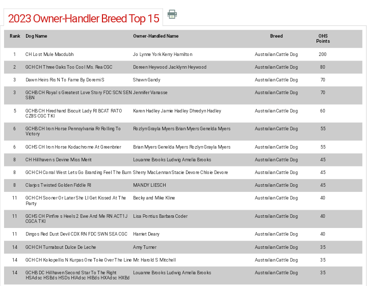 And Fiddle is tied for #8, with 45 total points. From her two Owner Handled Group 3, and 3 Owner Handled Best of Breed