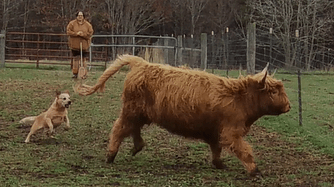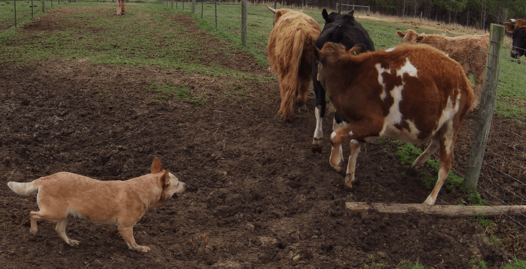 She was doing ok with the driving and the inside flanks, and switching back to gathering… However, the one highland cow in the group kept breaking and turning. Fiddle kind of lost her cool and managed to take a face kick.
