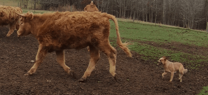 Mazikeen has this really super strong sense of balance. She wants to be bringing the stock back to me at all times. So in this exercise, we are gathering the cows, trying not to bite heels at the top, and bring them to me, and then past me. We get her to stop, and work that again.