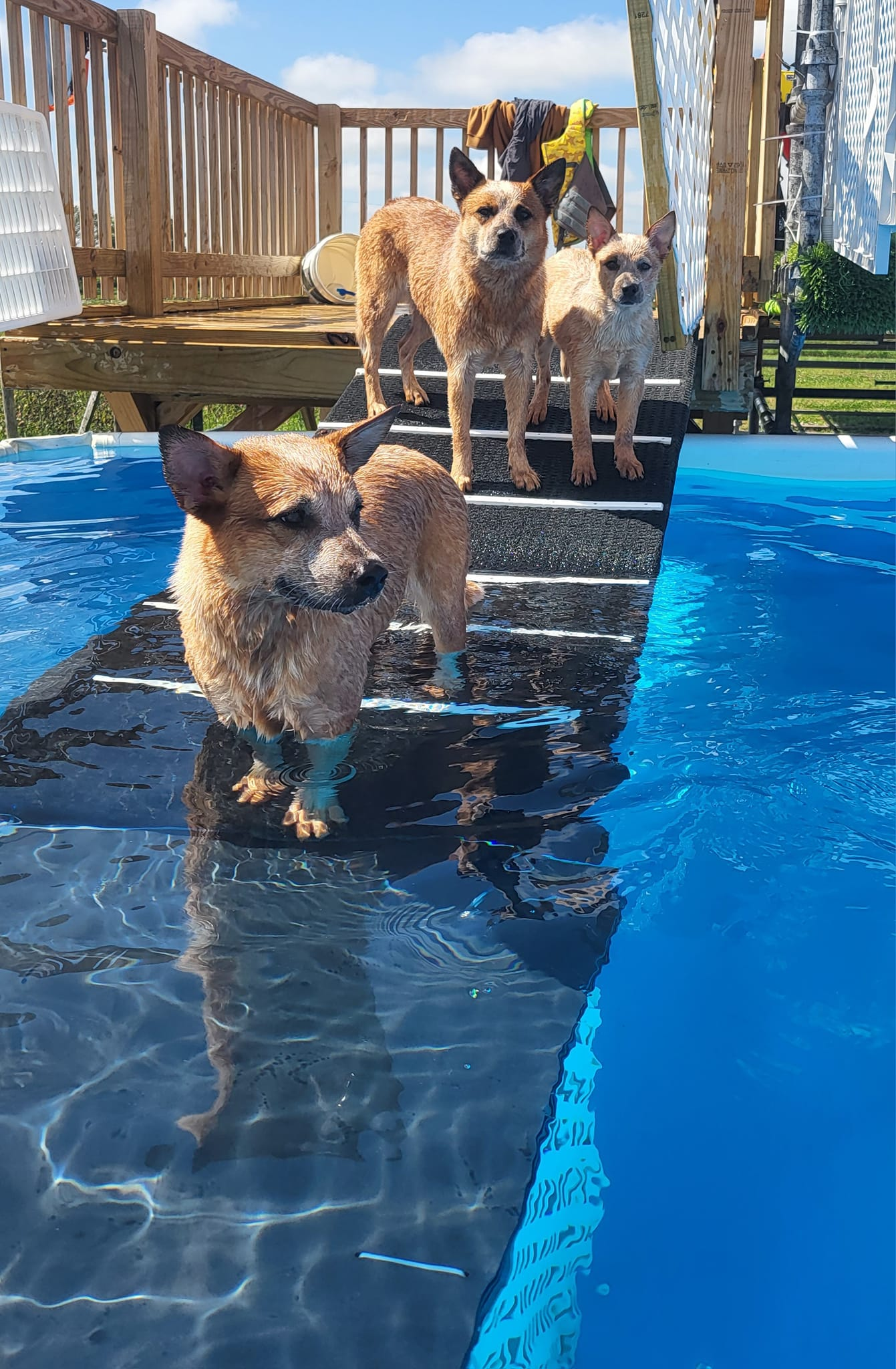 Left to Right, Ukulele, Chunky in the water with Mazie and Rory on the dock, Chunky swimming, and Fiddle waiting for me to throw.