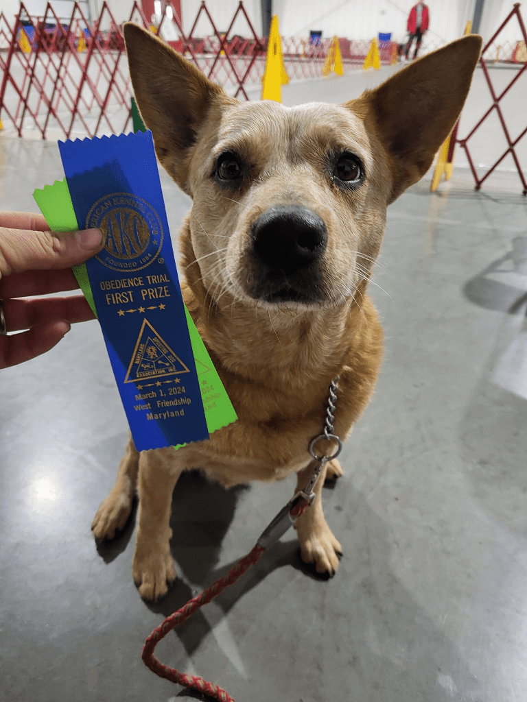 Fiddle Finished her Companion Dog Title (CD) with a score of 185.5 under Dave Brobst. We were the only qualifying score in Novice A!