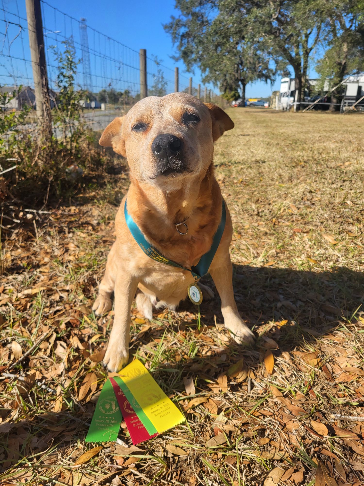 Fiddle managed to finish her Rally Excellent title, with a 2nd place, a 3rd place, and a qualifying ribbon in our very first outdoor trial, and won a super cool Medal for her title!