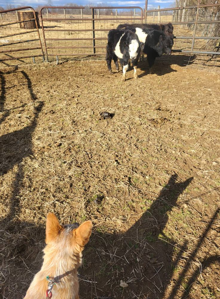 With Chunky (left), Mazikeen (right), and Fiddle, we worked gently moving cows along the fence line, driving and improving distances on the fetch and gather before going through some elements of courses (getting the cows to the cone in the middle of the field without moving way offline is still a big deal), then driving to the y chute. Chunky had a wonderful day, working as a sandwich to pull cows off the fence with me. In Mazies case, I have to be careful, as she prefers to be a bit more independent on what she wants, and following her shoulder draws her in rather than pushing her out, as when the cows are fetched to me, it is the picture she wants.