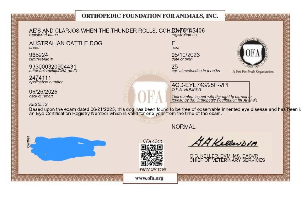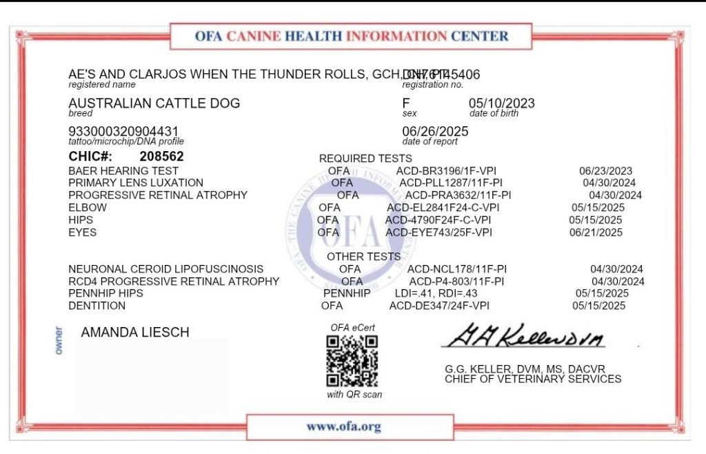 She has normal eyes, fair hips, normal elbows, full dentition, and is clear on all genetic eye tests.
