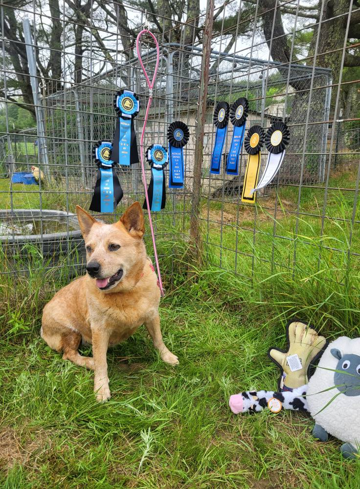 Fiddle won High Combined Non Australian Shepherd! She took 4th place in Started Cows (behind her 3 Daughters), and then won the afternoon session to finish her started cattle title on Friday. She won the open cattle class and took a 3rd place to finish her Open Cattle Title on Saturday. Sunday, she took 3rd in Advanced cattle in the morning, and then won Advanced Cattle in the Afternoon with a score of 113. It was pretty much a textbook perfect run, and we are now retired on trial cattle!