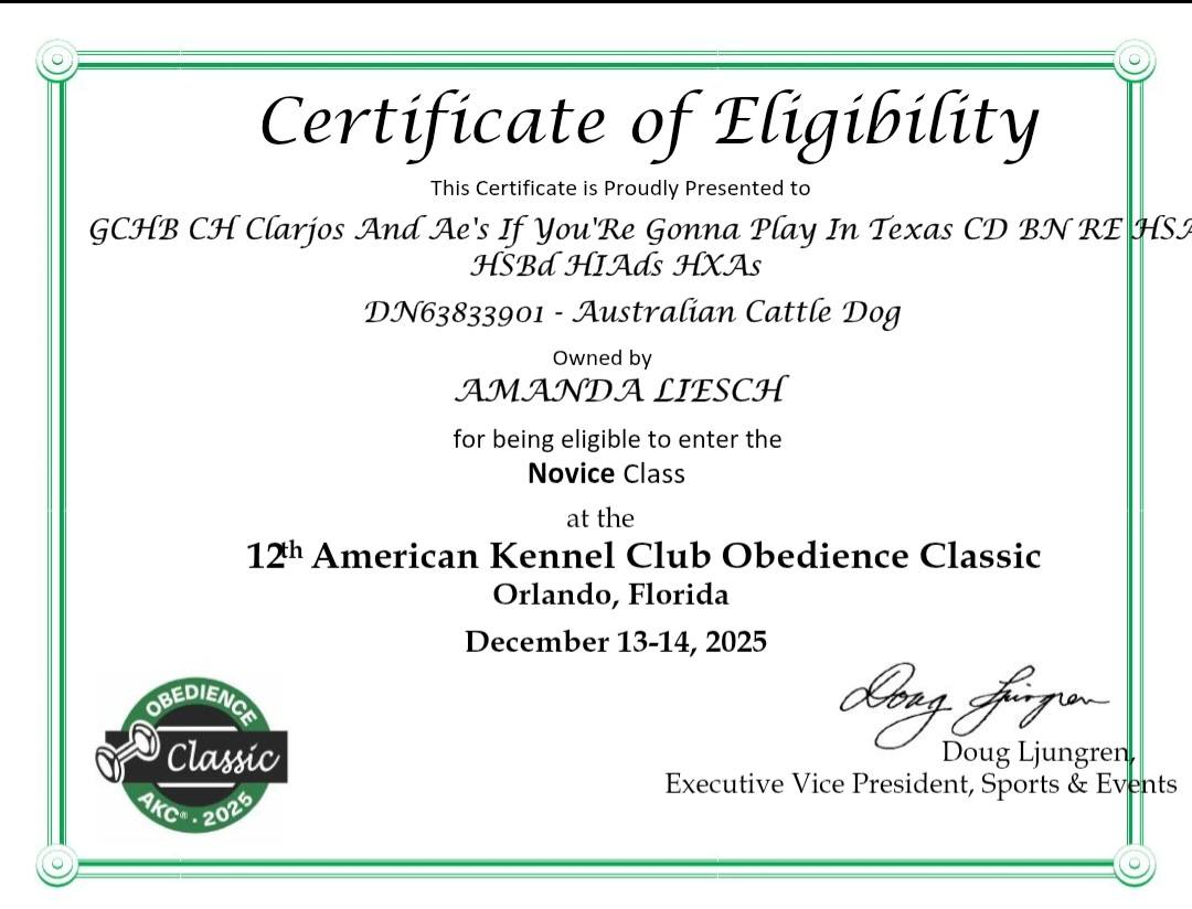 I am so excited to get the invitation to go to the Obedience classic. We are not going to be able to make it, as I have to work the Oaks and Allentown, PA shows, but she worked really hard last year to get everything done for me, and I look forward to continuing our obedience career in 2026!