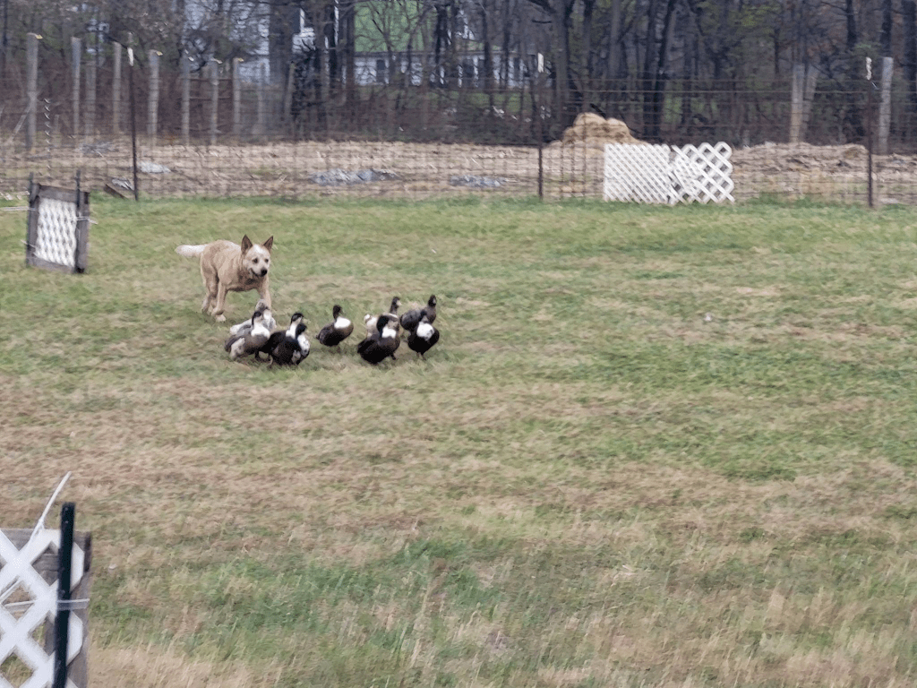 I brought the entire red gang out to Berryville to prepare for the ASCA trial, as we haven’t done some of these courses on sheep and ducks before. Fiddle and Mazikeen worked Advanced sheep and ducks, Rory worked open level ducks, and Chunky worked started ducks and sheep! It was worthwhile, as I have never worked driving ducks off of me from behind the advanced line for the ASCA E course before! It really showed us some of our weaknesses!
